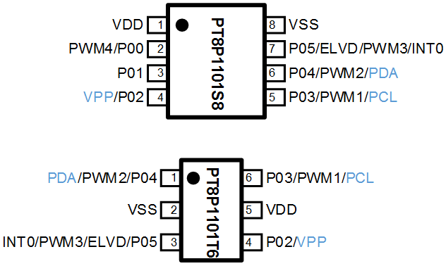 PT8P1101 是一款RISC内核, IO型8位MCU,其内置1K*14bit OTP ROM、48*8bit SRAM、TIMER、PWM、LVD等功能。主要应用于应用消费类电子产品。